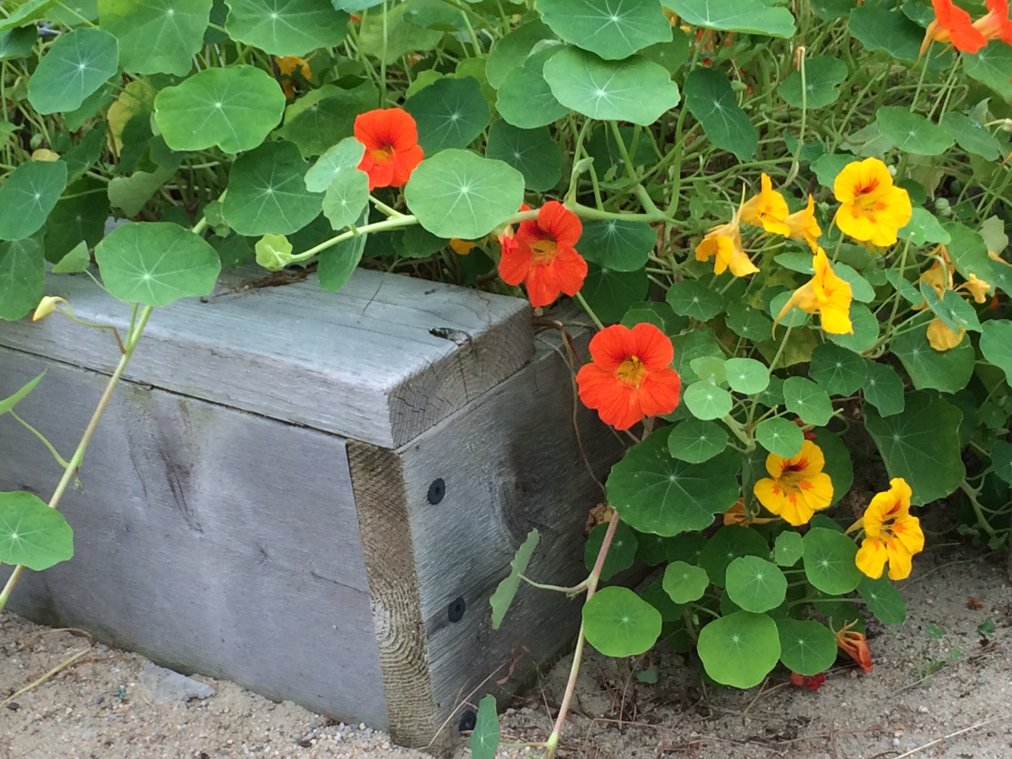 Each spring, volunteer nasturtiums emerge in our school greenhouse near the site of the previous year’s nasturtium plants. This is how I knew that nasturtium seeds would winter over in this unheated gardening classroom. So, last fall, as we collected nasturtium seeds and then pulled out the long, trailing frost-nipped plants, I decided to plant some of the rough, round, tan-colored seeds in pots for easy transplanting. We sunk the pots into a bed for warmth and I congratulated myself on bringing order to the anticipated spring growth. This spring, a few of these pots hosted seedlings, but many were empty. Meanwhile, volunteer nasturtiums popped up, as usual, wherever they pleased, heedless of my attempt to regiment their growth.