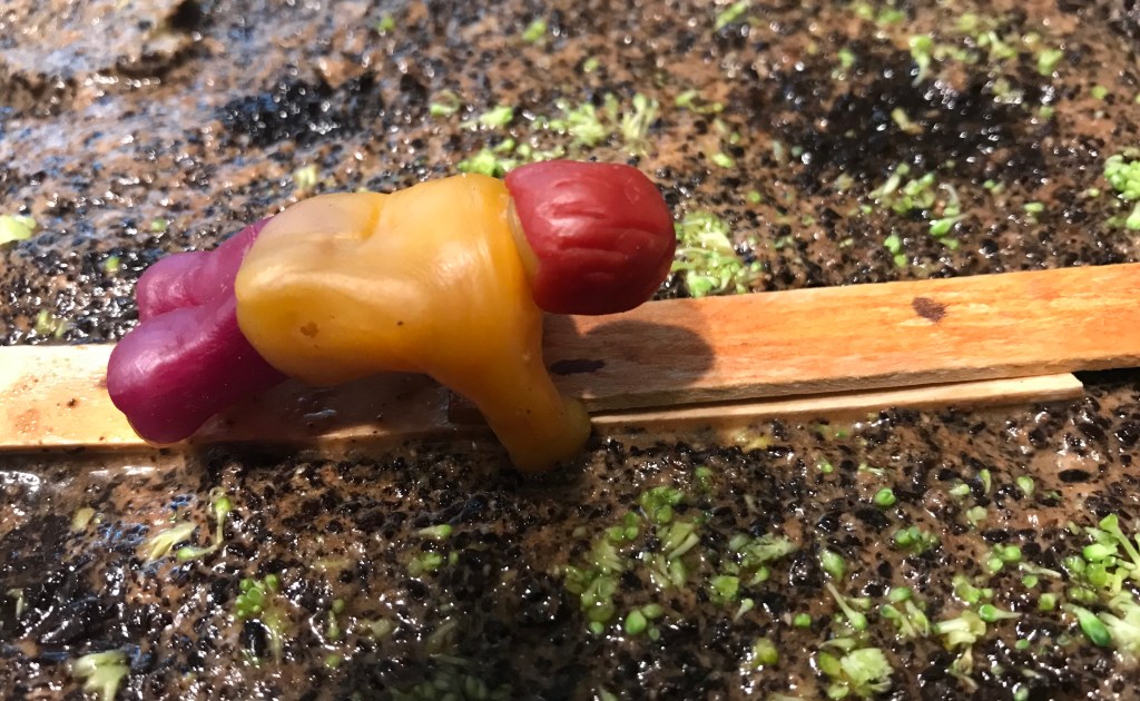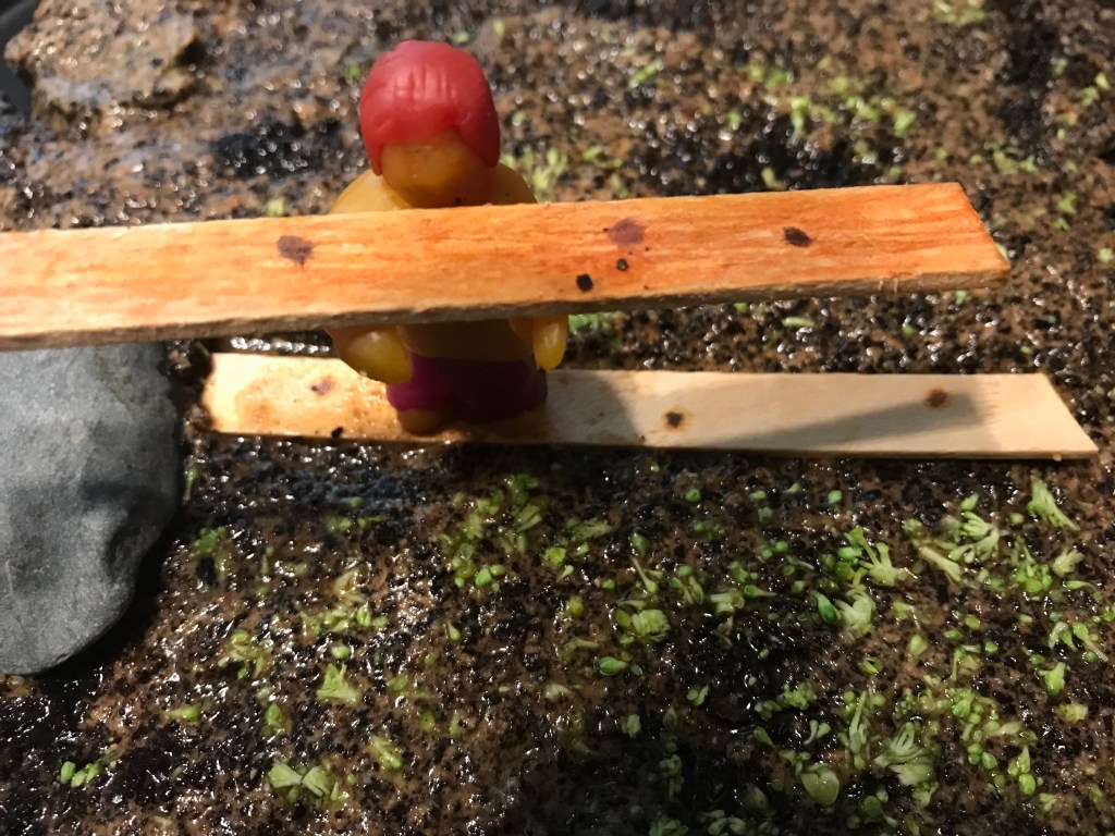 Next, Ronduin moved the very muddy darker board over the lighter colored board until it made the next section of his moving bridge. This time though he didn’t step to the next board right away. Feeling tired, he sat at the end of the lighter colored board. Crossing his legs and put his head in his hands, he remembered getting up very early, long before the sun rose. His stomach growled and he wished for a bowl of warm porridge.