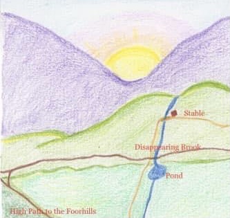 Rowan imitated Sir Andrew’s deep voice. “if you look far up to the top of this hill beyond the bridge, you can see the cows and sheep and maybe you will get a glimpse of Roland. We’re keeping the animals on this side of the brook because we don’t want them in the fields that we’re planting on the other side of the stable. They are used to grazing there in past years, so Roland is watching them carefully to be sure they don’t get any ideas about wading across the book. Today, after I drop this bread in the barn, I will ride to the Mountain Kingdom and I will see Roland on my way there. I will him tell about your arrival and bring him a loaf of your bread.”