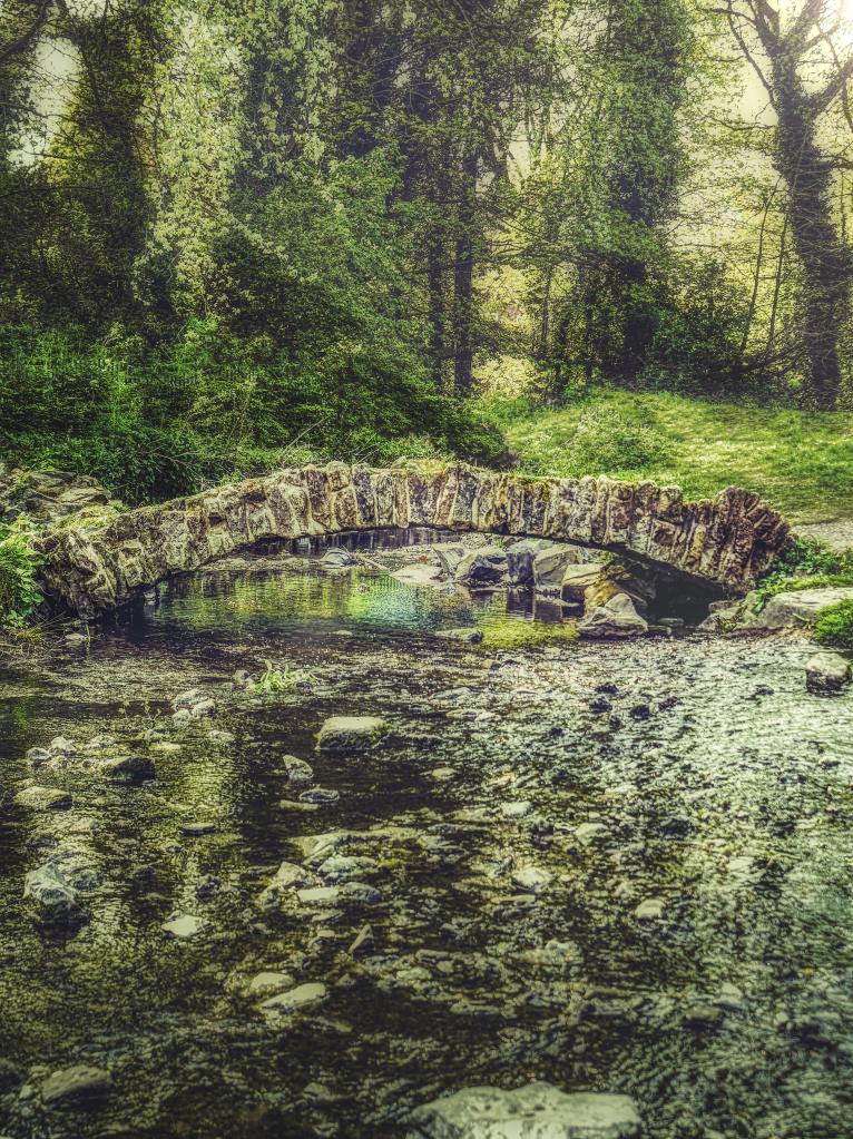 Mirabel ran in front of Rowan firmly grasping a corner of the bag that sat on her shoulder. Rowan made sure the bag was suspended between them and did not touch the ground. In this way, they ran uphill along the brook until they reached the stone bridge where they slowed to a walk.